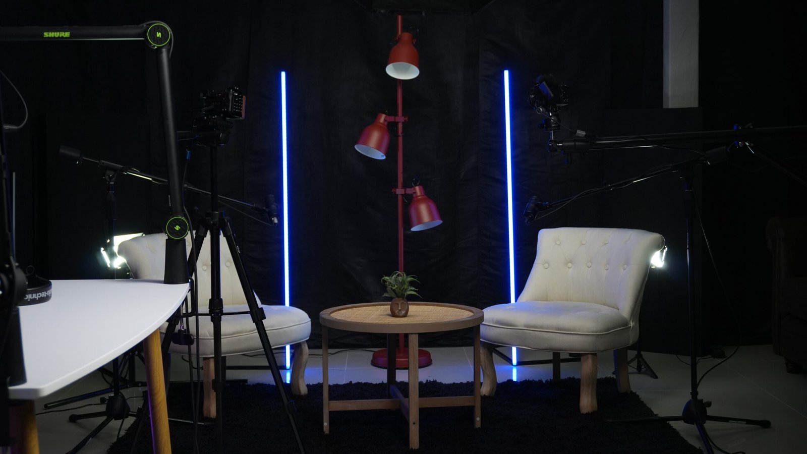 Estudio de grabación optimizado: distribución ergonómica, ambientes configurables por spot, iluminación RGB regulable y fondo modular con color ajustable. Diseñado para podcasts y formatos afines, prioriza comodidad operativa y flujo de trabajo claro.